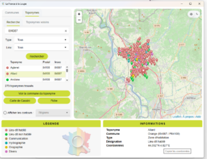 En effectuant une recherche par code dans l’onglet Toponymes, le logiciel affiche tous les toponymes appartenant à la commune du code recherché.